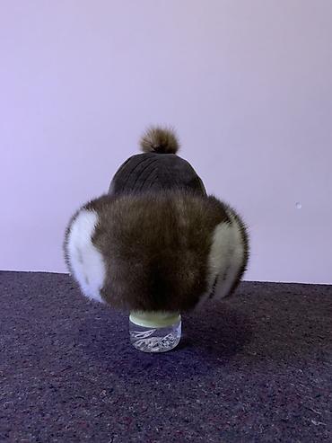 Шапка из натурального меха норки, цвет — насыщенный чёрный. - Форма: круглая/таблетка с объёмной посадкой. - Отделка: два пушистых помпона из того же меха; декоративный шнурок с металлической пруж...