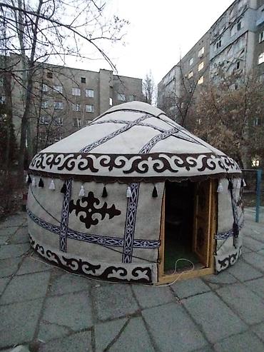 Предлагается традиционная юрта, отличающаяся своей конструкцией и декором. Внешняя часть юрты выполнена в светлых тонах с характерными темными орнаментами, включающими геометрические и стилизованные узоры. Внутреннее убранство включает деревянный каркас с тканевыми элементами, украшенными яркими узорами. Внутри установлен полукруглый стол с резными элементами, а пол покрыт ковром с традиционными мотивами. Юрта подходит для создания уникальной атмосферы на мероприятиях, в качестве гостевого домика или для тематического отдыха.