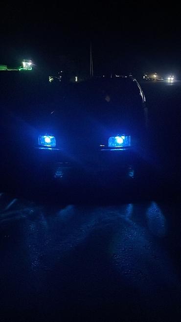 - Прямоугольные фары с синей подсветкой/ксеноновой оптикой на фото ночью
