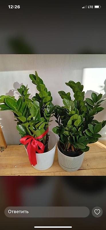 - Замиокулькас (долларовое дерево) — плотные темно‑зеленые глянцевые листья на мощных черешках. Подходит для офиса и дома, хорошо переносит полутень и редкий полив. Идёт в белых кашпо, одно оформлено красной лентой — готовый вариант для подарка.