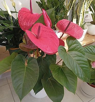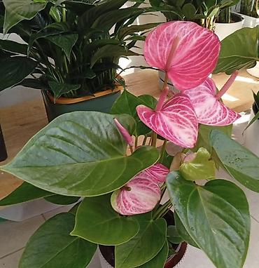 - Антуриум — крупные сердцевидные листья и яркие прицветники: насыщенно‑розовые и розово‑белые. Длительное цветение, декоративен круглый год. Предпочитает рассеянный свет и умеренный полив.