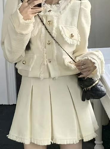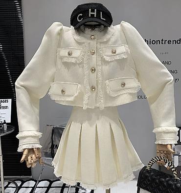 Костюм-тройка в стиле твид: укороченный жакет + плиссированная мини-юбка + топ (в комплекте с жакетом и юбкой).