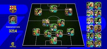 Игровой аккаунт eFootball с прокачанной командой (эмблема FCB) и общей силой состава 3214. Ключевые особенности: - Сбалансированный стартовый состав 11: сильные позиции по всем линиям, включая вра...