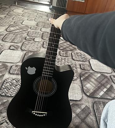 Акустическая гитара 6-струнная, корпус дредноут с вырезом (cutaway) для удобного доступа к верхним ладам. Матовая чёрная окраска, декоративная окантовка розетки и белые колки бриджа. На деке наклейка в виде логотипа «яблоко».