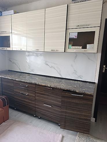 - Столешница: каменная фактура темного мрамора с фаской, единое длинное полотнище.