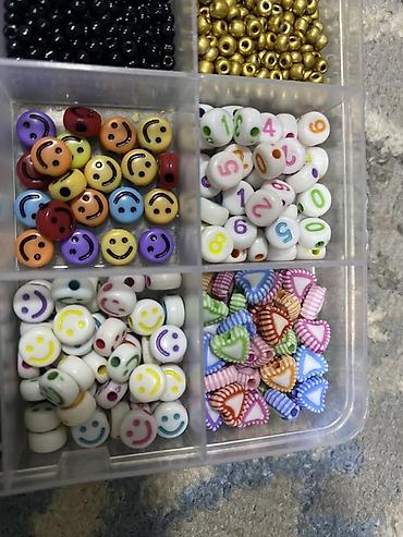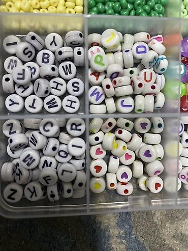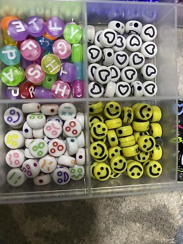 - Тематические элементы: плоские круглые бусины с эмодзи/смайликами разных цветов, белые бусины с черными сердечками, разноцветные прозрачные бусины с буквами, белые кубики и круглые бусины с буквами и цифрами, бусины с разноцветными мордочками, неоновые сердечки.