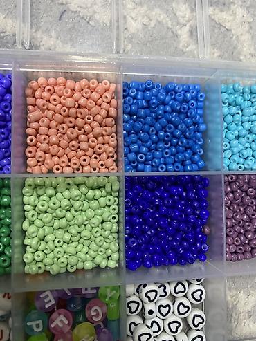 - Разнообразие бусин: классические круглые (размер около 4–6 мм) в широкой палитре — белые, черные, серебристые, золотистые, пастельные и яркие оттенки синего, бирюзового, фиолетового, зеленого, персикового, желтого и др.