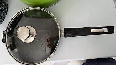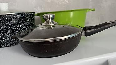 - Сковорода-сотейник с антипригарным покрытием и стеклянной крышкой. Съемная пластикова́я ручка с фиксатором.