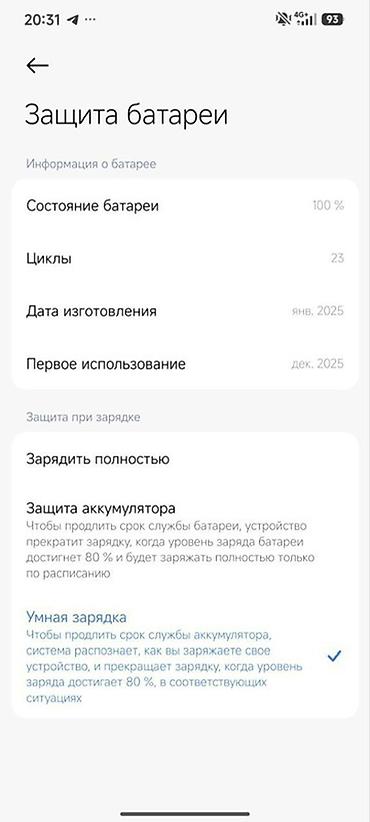 - Состояние батареи в системе: 100%, 23 цикла; дата изготовления батареи: янв. 2025; первое использование: дек. 2025.