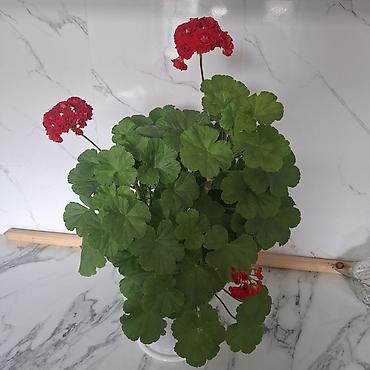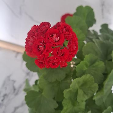 Предлагается цветущее растение герань с яркими красными цветами. Растение имеет пышную зеленую листву и крупные соцветия, состоящие из множества мелких бутонов. Подходит для выращивания в домашних условиях или на балконе, добавляя яркий акцент в интерьер или экстерьер.