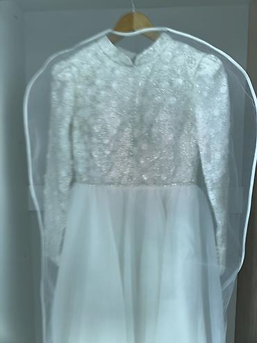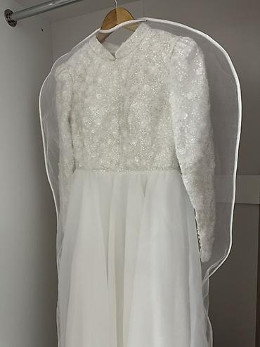 Платье создает утонченный, скромный образ невесты, хорошо держит форму и красиво играет на свету за счет мерцания вышивки и воздушности юбки. Подойдет для торжественной регистрации и банкета.