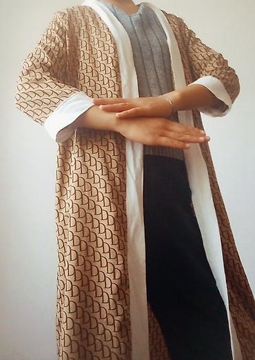 Элегантная свободная абайя/кимоно в молочно‑белом цвете. - Прямой удлинённый крой, открытая передняя часть без застёжек. - Длинные широкие рукава с декоративной отделкой: тонкая контрастная тесьма...