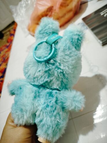 - Материал: плюшевый мех бирюзового цвета, пластиковое лицо с крупными глазами и «зубастой» улыбкой.