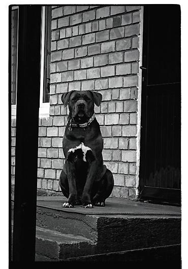 Собака (похожа по типу на крупную гладкошерстную породу с черно-рыжим
