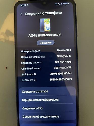 На четвертом фото показаны данные устройства: Galaxy A04s, серийный номер R58TA0WXY7R, IMEI (слот 1) 41, IMEI (слот 2) 49.