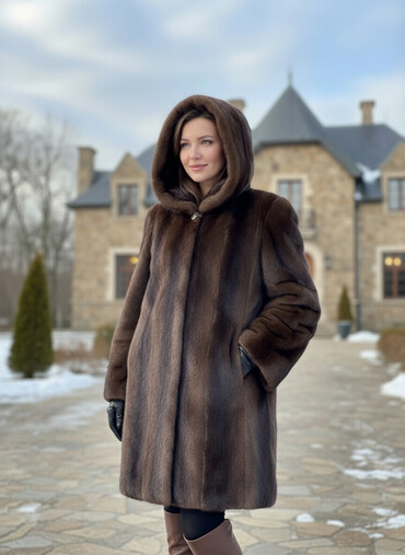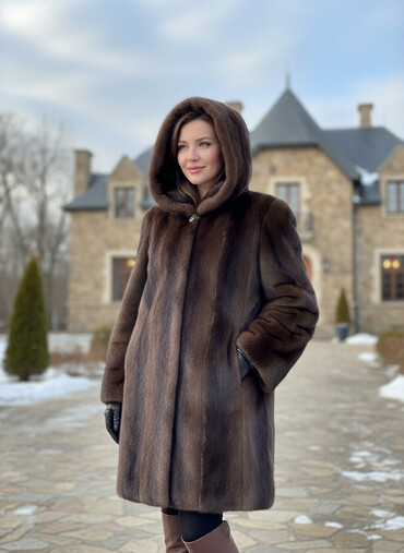 Норковая шуба из кусочков, размер 46–48. - Натуральный мех норки, фактурная раскладка из кусочков с красивым переливом коричневых оттенков. - Прямой силуэт до колена. - с капюшоном, у воротника де...