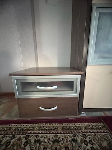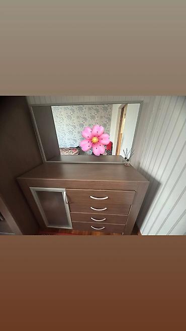 - Туалетный столик/комод с зеркалом: четыре выдвижных ящика + боковое отделение с матовым стеклом и ручкой.