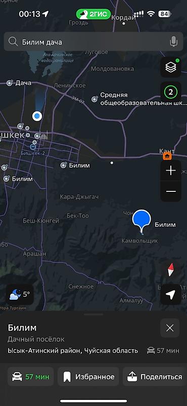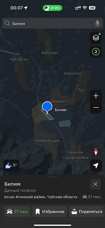 - Локация: дачный поселок Билим (см. скриншоты 2ГИС). Указана привязка на карте, ориентир — близость к населенным пунктам Шевченко, Туз, Камвольщик, Чон-Далы; до Бишкека ориентировочно 30 минут на автомобиле.