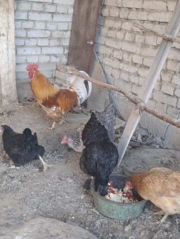 - Породы/масти: черные, рыже-коричневые, серо-пестрые куры; петух крупный рыже-белого окраса.