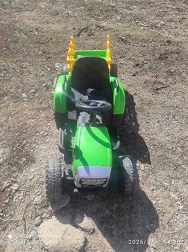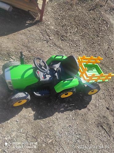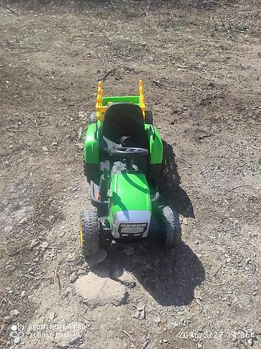 - Яркий зеленый трактор с открытым кузовом-прицепом (съёмные жёлтые борта) для перевозки игрушек и грузиков.