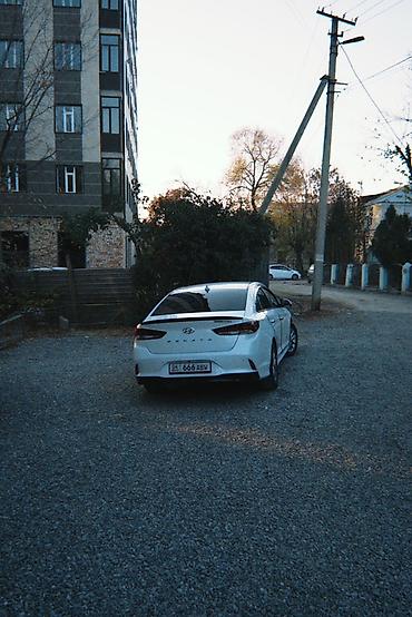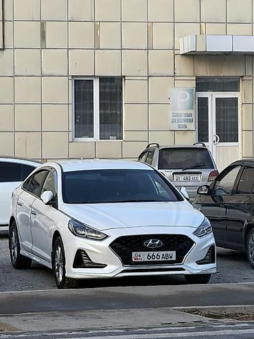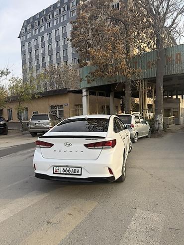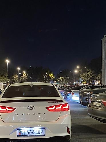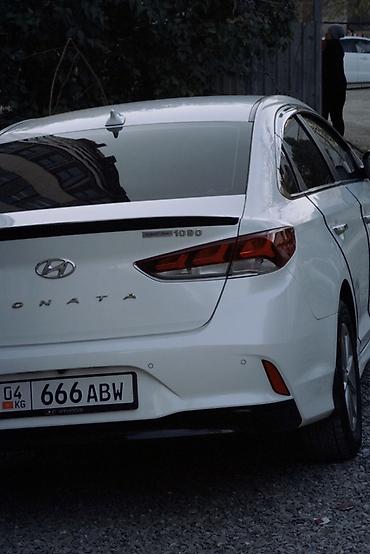 Hyundai Sonata, белый седан бизнес-класса (рестайлинг). Стильный дизайн: крупная шестигранная решётка радиатора, светодиодные ДХО, выразительные задние фонари, аккуратный спойлер на крышке багажника. Легкосплавные диски, хромированные молдинги, акулий плавник антенны. Тонированные стекла.