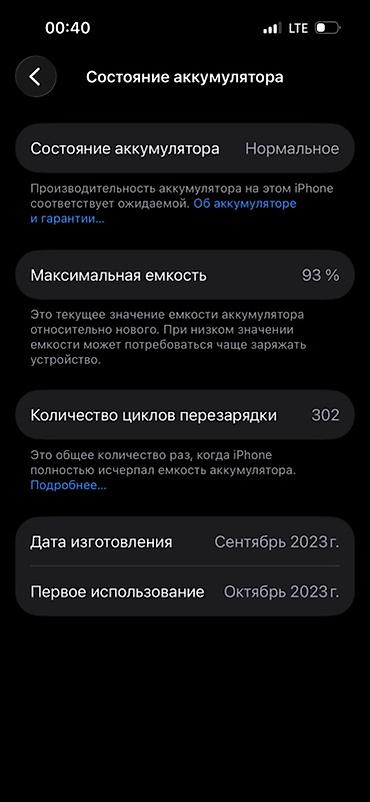 - Аккумулятор: состояние «Нормальное», максимальная ёмкость 93%, количество циклов перезарядки 302