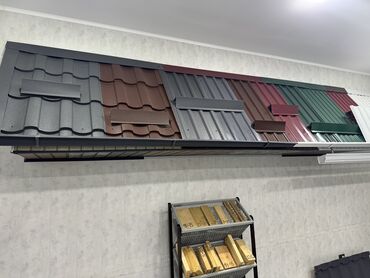 - Комплектующие: планки примыкания, коньки, карнизные и торцевые элементы, доборные детали, водосточные элементы (видны на стенде).