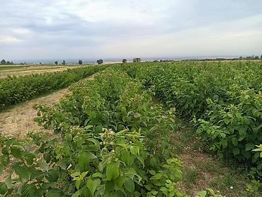 Малина с плантации — свежие ягоды Описание: - Плантация малины с ровными рядами, ухоженными междурядьями и опорной системой по периметру. - Сорт: десертная красная малина (ремонтантного типа по ви...