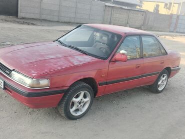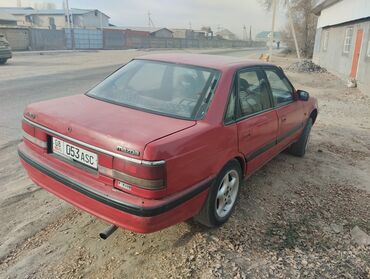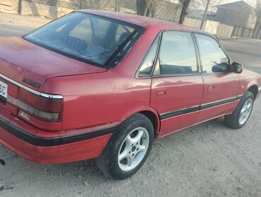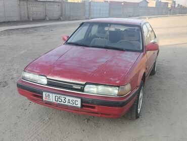 Mazda 626 седан, красный цвет, номерные знаки KG. Кузов 4-дверный, классический прямоугольный дизайн фар и фонарей. Шильдики: 626 и 2.0i на крышке багажника, Mazda на решётке — бензиновый двигатель 2.0 литра.