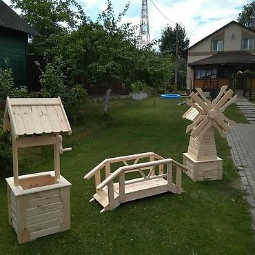Мебель для сада. Декор для сада. Садовый декор. Мельница. Колодец. Мост. Декоративный мостик для сада. Мельница для сада. Колодец для сада. Садовый интерьер.