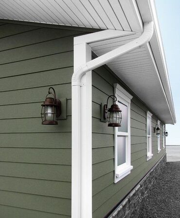 - Водосточные системы: пластиковые/металлические желоба и трубы, углы, колена, воронки, крепления — для отвода осадков и защиты фасада.