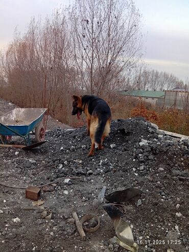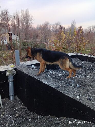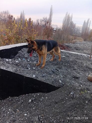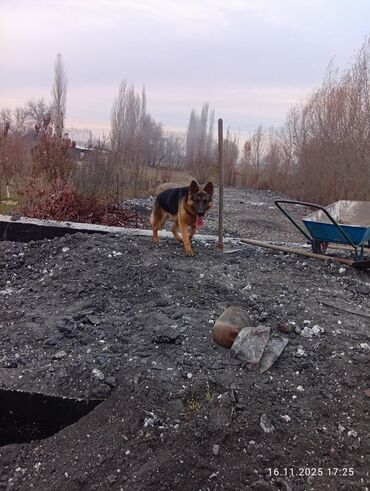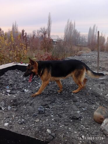 Немецкая овчарка, классический чепрачный окрас (чёрная спина, рыжие лапы и грудь). Крупный, мускулистый кобель с правильной посадкой ушей и мощной грудью. Активный, внимательный, с выраженным охранным инстинктом — отлично ориентируется на участке, быстро реагирует на посторонние звуки и движения.