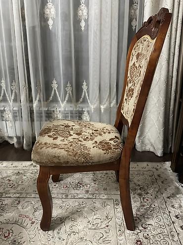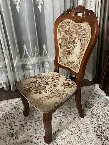 - Материалы: массив дерева с тёплым коричневым тоном; сиденье и спинка с мягким наполнением, обивка жаккардового типа с цветочным узором в бежево-коричневой гамме, окантовка золотистым кантом по спинке.