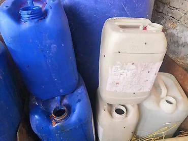 - На фото также канистры из пластика (примерный объем 20–30 л) с ручками и винтовыми горловинами — удобно для транспортировки и порционной раздачи жидкости.