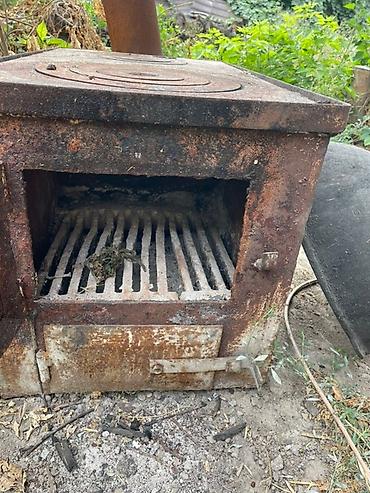 Печь-буржуйка коричневого цвета, выполненная из металла с