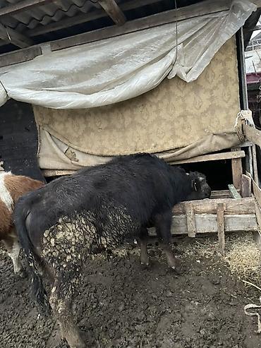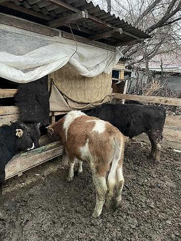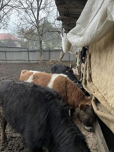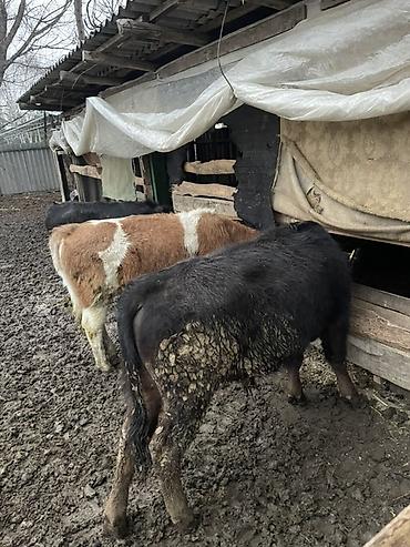 Телята мясного направления - Группа телят, содержатся в крытом помещении на привязи у кормушки. - Окрас разный: чёрный, бурый, светло‑рыжий. - Возраст по виду — молодняк, активные, упитанные. - Уш...