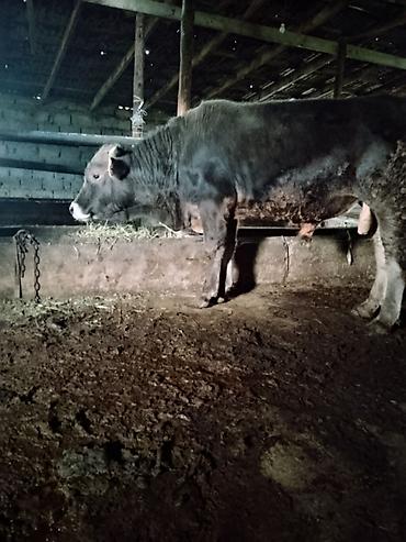 Бык мясного направления. - Окрас: темно‑серый с белой головой. - Рога сформированные, бирки на ушах. - Крупный, широкая грудь и зад, выраженная мускулатура. - Содержится в стойле, приучен к привяз...