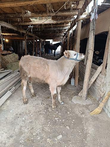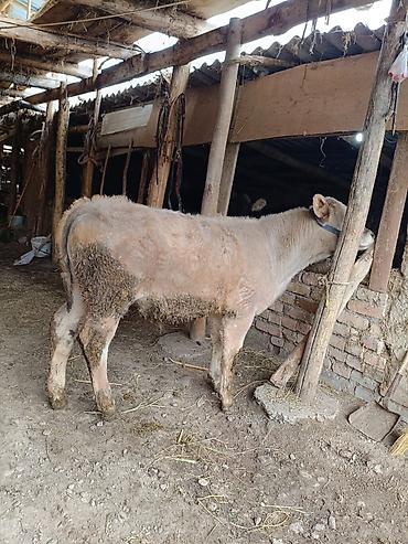 Бычок молодого возраста, светло-палевой масти с белой головой. На фото — крепкий телец мясного типа, ровная спина, широкий корпус, хорошо поставленные ноги. Спокойный характер, ходит на недоуздке, привязан к кормушке без сопротивления. Содержится в крытом хлеву, на подстилке из соломы. Кормление — сено и грубые корма, доступ к воде. Подходит для откорма на мясо или дальнейшего выращивания. Возможен осмотр на месте (видно по фото стойла и привязи).