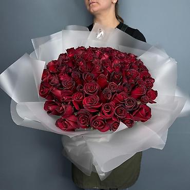 - Классические красные розы с крупными бокаловидными бутонами насыщенного алого оттенка.