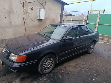 Audi 100 C4, седан, черный цвет. Киргизские номера (KG 08, 184 AVF). Кузов с фирменной решеткой радиатора и эмблемой Audi, оранжевые передние указатели поворота, прямоугольные фары. Легкосплавные диски. Тонированные стекла. Сзади — фаркоп, задние комбинированные фонари, место под ключ замка крышки багажника. Дворник на заднем стекле отсутствует (как на седане), высоко расположенные зеркала.