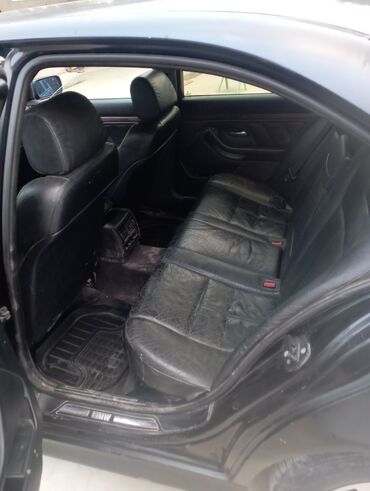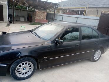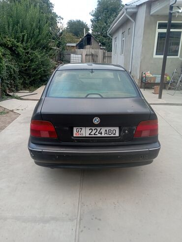 BMW 5 Series (E39) седан, черный цвет кузова. Классический дизайн с фирменной решеткой радиатора и округлой оптикой. Легкосплавные диски BMW, 4 двери, тонированные стекла. На кузове хромированные молдинги по бокам и на бамперах. Установлены брызговики, штатные зеркала с электронастройкой, задние парктроники. Номера: KG, регион G7 (на фото).