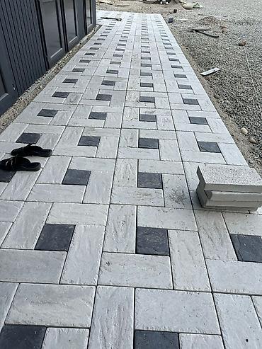 Тротуарная плитка «Кирпичик» двухцветная (серый/белый) - Форма: прямоугольные элементы с фактурой натурального камня + квадратные вставки. - Укладочные схемы: «кирпичная кладка», «квадраты/рамки»,...