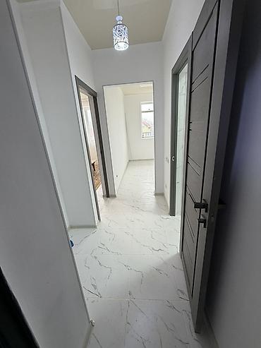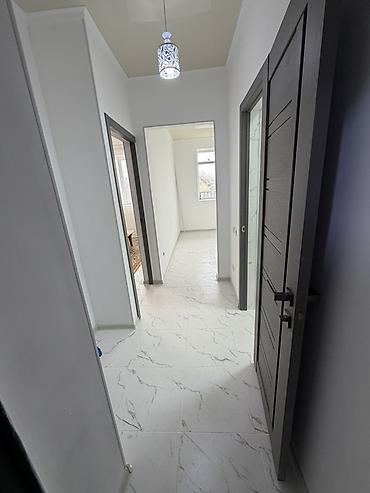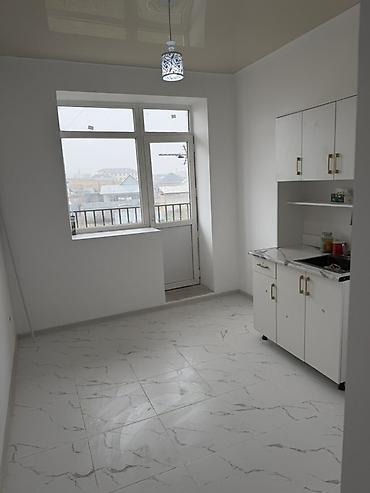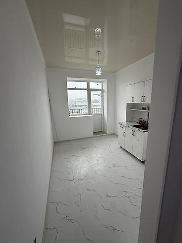 - Отдельная кухня вытянутой планировки с окном и выходом на небольшой балкон/лоджию. Пол — крупноформатная плитка под мрамор, натяжной потолок с двумя подвесными светильниками. Установлены навесные и напольные кухонные шкафы с мойкой и рабочей поверхностью.
