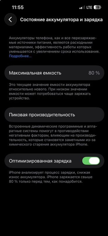- Аккумулятор: максимальная ёмкость 80%, оптимизированная зарядка включена