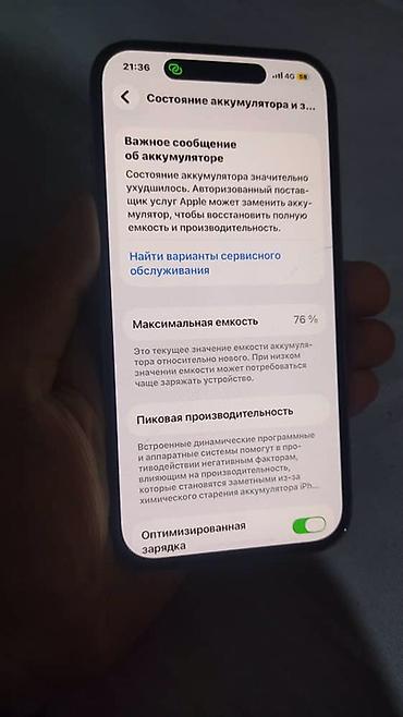 - Состояние аккумулятора: максимальная емкость 76%, отображается сообщение о необходимости сервисной замены для восстановления полной емкости и производительности