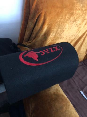 Автомобильный сабвуфер цилиндрической формы с логотипом JUZX. Корпус обтянут черным карпетом, что помогает защитить его от повреждений и приглушить вибрации. Сабвуфер оснащен панелью управления с регуляторами и разъемами для подключения. Этот тип сабвуфера идеально подходит для установки в багажнике автомобиля, обеспечивая мощное и качественное звучание басов для любителей музыки в дороге. Компактный дизайн позволяет эффективно использовать пространство.