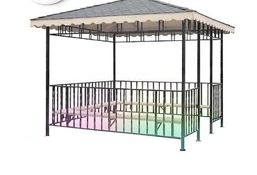 Металлическая беседка/навес с деревянным настилом. - Каркас из профильной трубы, сварные ограждения по периметру. - Крыша из профнастила, двухскатная, защищает от дождя и солнца. - Пол из деревянн...