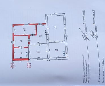 - На участке расположены: жилой дом (выделен синим на плане) и отдельно стоящее строение/пристрой (выделено красным).