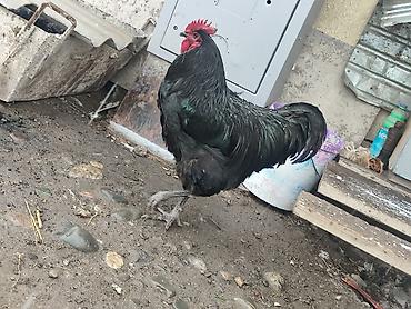 Петух (черный окрас с коричневым отливом) Описание: - Крупный, высокий, длинноногий петух с плотным корпусом и развитым хвостом. - Оперение преимущественно черное, на гриве и спине — коричневые/ры...