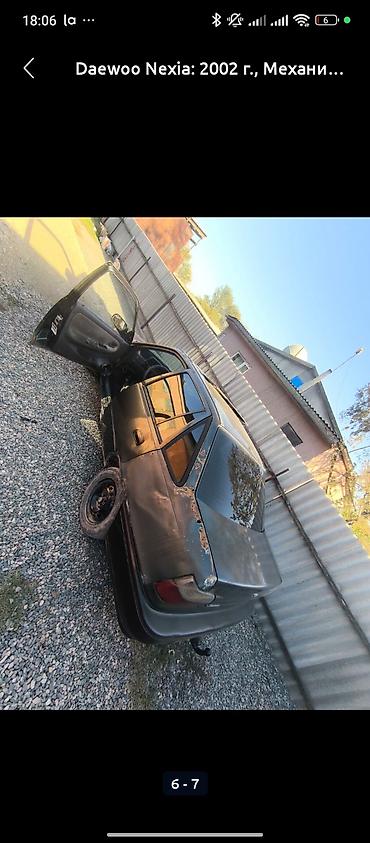 Daewoo Nexia, седан, 2002 год, механическая коробка передач. Темно‑серый кузов, тонированные стекла. Четыре двери, багажник с большим проемом. Установлен люк на крыше. Передняя оптика прямоугольная, задние фонари классической формы. На бампере сзади — фаркоп. Номерные знаки KG (регион 05). Колеса стальные, запаска на фото. Салон пятиместный, передние сиденья с регулируемыми подголовниками. Подходит для городских поездок и повседневного использования.